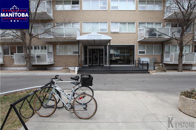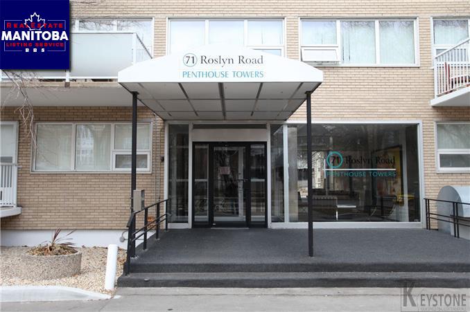Beautiful two bedroom condominium unit in Penthouse Towers on the quiet side of Roslyn Road. This 908 square foot unit has a south facing balcony with a great sunlit view of Osborne Village. The kitchen is large with white shaker style cabinets, four(4) modern stainless style appliances and offers lots of cupboard space. There's a separate dining room, large front hall closet and fully modern bath with shower and tub. Both bedrooms are spacious with roomy closets and large windows that offer beautiful natural light. There are newer PVC windows, air conditioning, shared laundry close by on the same floor, large storage locker and an energized parking stall well located close to entry.
