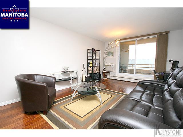 St. Vital. Updated, clean and bright two-bedroom corner end unit with quiet concrete construction. Condo is modern and comfortable with engineered walnut hardwoods, newer tripane windows, a spacious maple kitchen with granite countertops, four stainless appliances and a beautiful caesarstone island of pot drawers. The huge living room has room for dining table and sliding door access to the covered, private balcony. A hallway separates bedrooms from the living room so you can actually live with someone here. The bathroom has tile floor and tub surround with nice lighting. This unit features a generous storage room, mirrored coat closet, insuite washer/dryer combo unit (there are larger shared laundry machines on every floor for bedding & towels) and the best heated underground parking spot in the building. Condo fee includes heat, hydro, parking and water. Location is excellent with shopping, transit, schools and amenities near. One small cat or dog allowed.