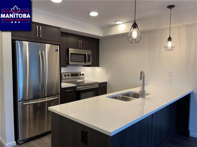 The 'Discovery' Floorplan. Brand new with a warranty. Open concept Kitchen has dark brown thermafoil cabinets, white quartz counters, double undermount sink/upgraded faucet, tiled backsplash, under cabinet lighting, and SS kitchen appliances. This suite is conveniently located close to the elevator/stairs. Luxury vinyl plank floors have been added throughout the living space and bedrooms are carpeted. In suite laundry - washer/dryer and included. Soundproofing is built beyond MB building code and offers STC ratings of 57. All suites come with state of the art wall mounted A/C units to keep cool. These suites are all pet friendly. Large amenity rooms include a party room (rentable to host a private party) and a gym! Live close by to so much shopping, easy access to downtown, bus stops close by. Heated u/g parking. Suite comes with 2 parking stalls - 1 inside 1 surface. The 1st photos are the actual suite, the next set are of a similar display. We are currently open by appointment only.