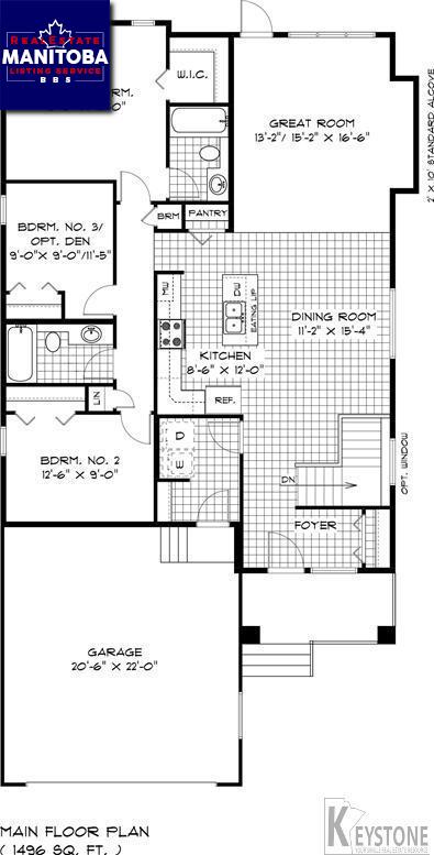 3K//Winnipeg/Land value $ 135, 604.00 plus G.S.T.NO IMPACT FEES - BUNGALOW - 1496 sq. ft. - LAKE LOT - 3 bedrooms - Great Room features a 9'-0' Patio Door, Pot Lights, Alcove for future Ent. Centre - Large Dining Room 15'-4' x 11'-2', Kitchen with Large Island and 71 ' x 40' Window, 3 Pot Lites, and 2 Pendant Lights above Island - LAUNDRY ROOM ON MAIN FLOOR - TWO STEEL BEAMS IN BASEMENT - Flat painted ceilings - 22' -0' x 22'-0' Garage, Insulated garage Door, Piled, Concrete Drive and Walk, 7 Year New Home Warranty.